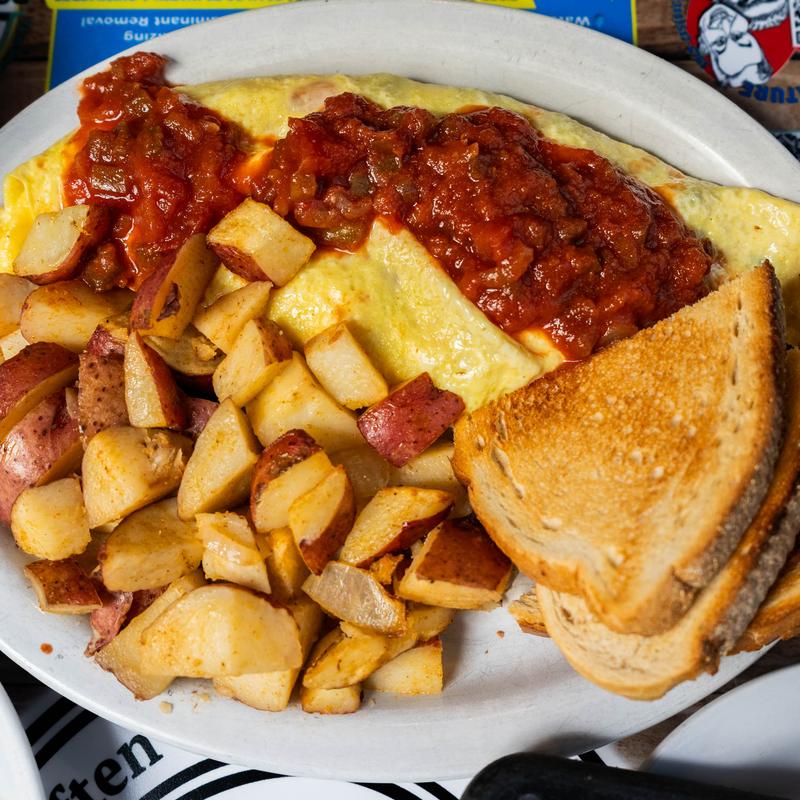 Your choice of three pancakes, three French toast, tower of power, or waffle, two eggs any style, two sausage links, two bacon slices, home fries, and your choice of toast.