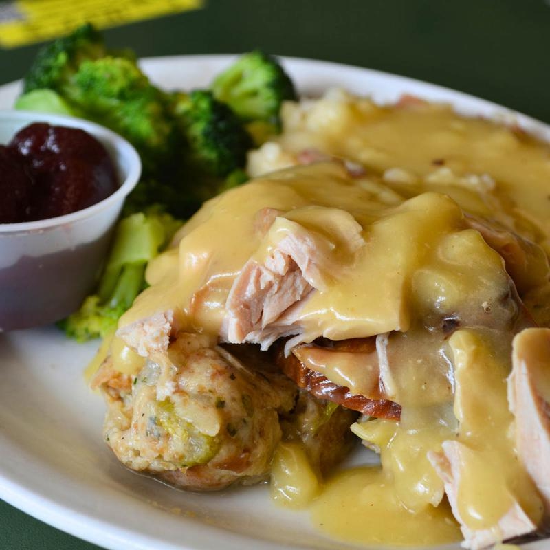 With herb stuffing, turkey gravy, cranberry sauce, mashed potatoes and side vegetable.